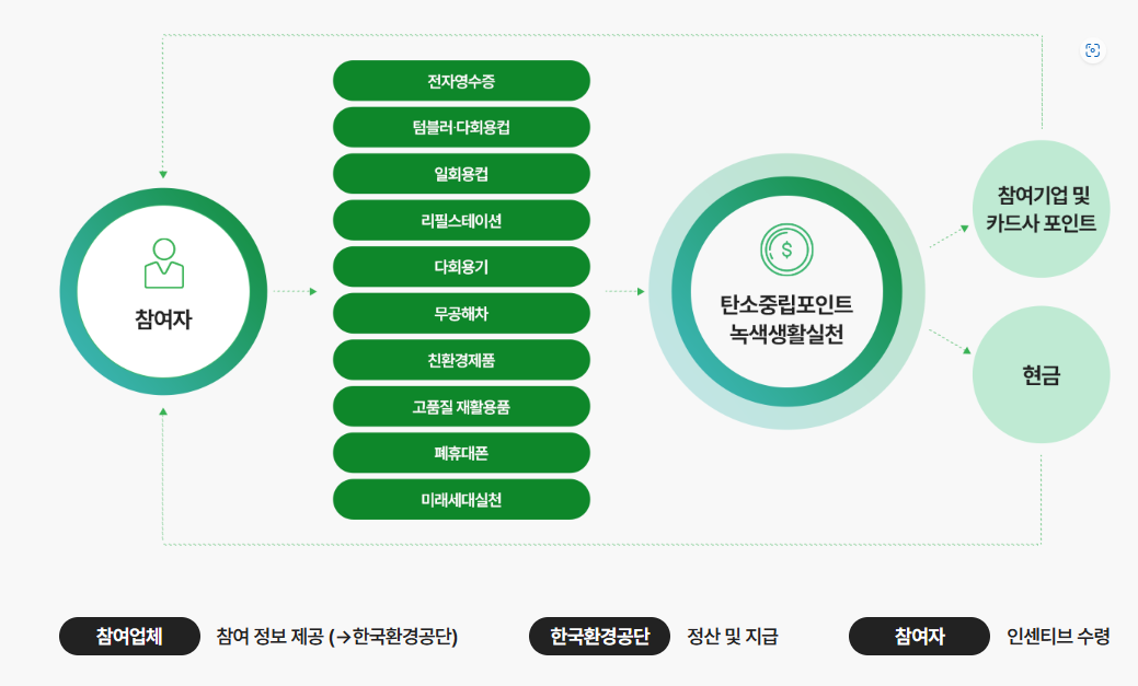 일반 국민의 탄소중립 생활 실천 문화 확대를 위해 많은 민간 기업의 친환경 활동 이용시 그 이용 실적에 따라 인센티브를 지원하는 제도 입니다. 탄소중립 포인트 녹색생활 실천 누리비에서 회원 가입을 통한 참여가 가능합니다. 전자영수증 발급, 텀블러 및 다회용컵 사용, 일회용컵 사용후 반환, 리필 스테이션이용, 다회용기 이용, 무공해차 대여, 친환경제품 구매, 고품질 재활용품 배출, 폐휴대폰 반납, 미래세대실천 행동등 실천할수 있는 항목도 많고 실 생활에서 다양하게 실천할수 있는 요소들이 많이 있습니다. 참여하시면 현금이나 참여기업 카드사의 포인트로 받을수 있으며 1인당 최대 7만원까지 지원이 가능합니다. 매 월말에 지급되며 대상에 따라 단가가 다릅니다. 건당 100원에서 부터 1000원 2000원까지 다양한 금액이 형성되어있습니다.