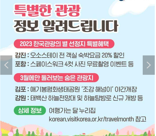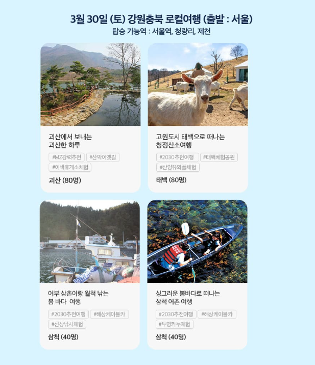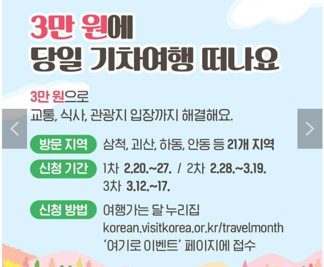 문화체육관광부가 '3월엔 여기로'라는 당일 기차여행 프로그램을 통해 지역관광을 촉진하고 있는 소식을 들었습니다. 이 프로그램은 전라, 충청, 강원, 충북 등 다양한 지역을 여행하는 것으로 보입니다. 프로그램에는 지역 특산물과 이색 체험 등이 포함되어 있어 참가자들이 다양한 경험을 즐길 수 있을 것으로 기대됩니다.